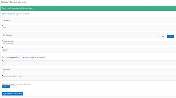 1. В разделе "Перевірка включення" нужно заполнить поля информацией о себе: ФИО, дату рождения, электронную почту, а также место проживания - область, район или город, город или другой населенный пункт, городской район. После нажать на кнопку "Перевірити вказані дані".