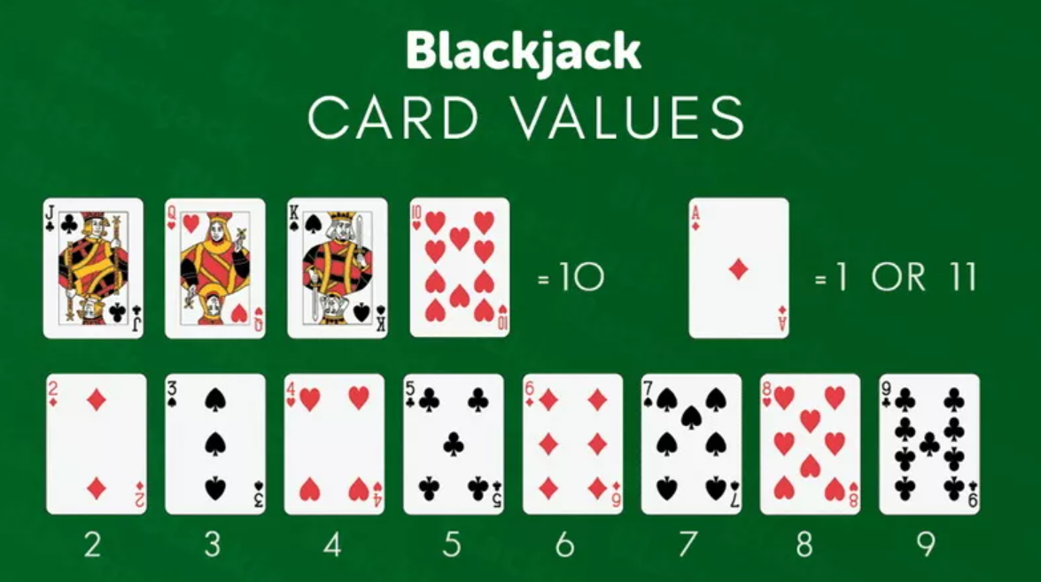 Карты имеют следующие значения: карты от 2 до 10 считаются по номиналу, валет, дама и король дают 10 очков каждая, а туз может считаться как 1 или 11 очков в зависимости от ситуации.