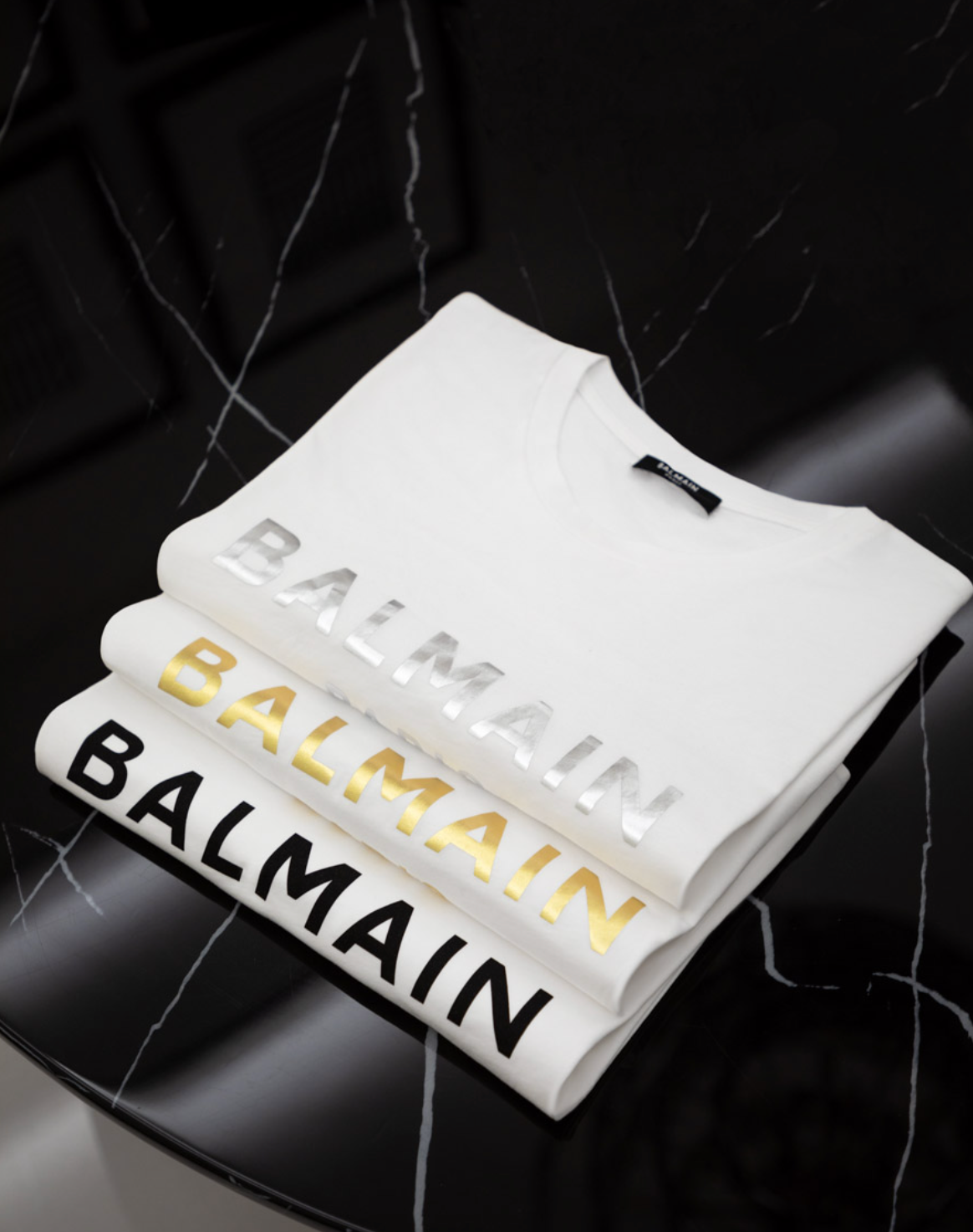 Футболка з логотипом Balmain (біла або чорна), чорні джинси або джинси з ефектом потертості, високі кросівки (Balmain, Louis Vuitton або Alexander McQueen), шкіряна байкерська куртка або оверсайз-бомбер. Структурована футболка з логотипом задає тон, а багатошаровий верхній одяг надає образу текстури та характеру — фірмової естетики Balmain.